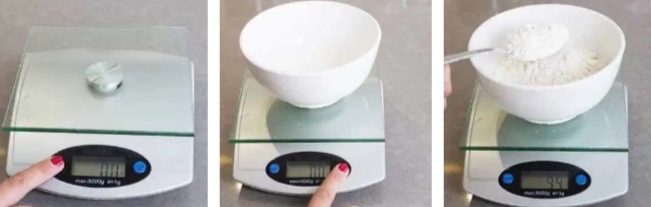 1. Set button g (gram) atau oz dahulu. 2. Letakkan bekas (mangkuk). Baru tekan 00 3. Masukkan bahan dan mula menimbang.